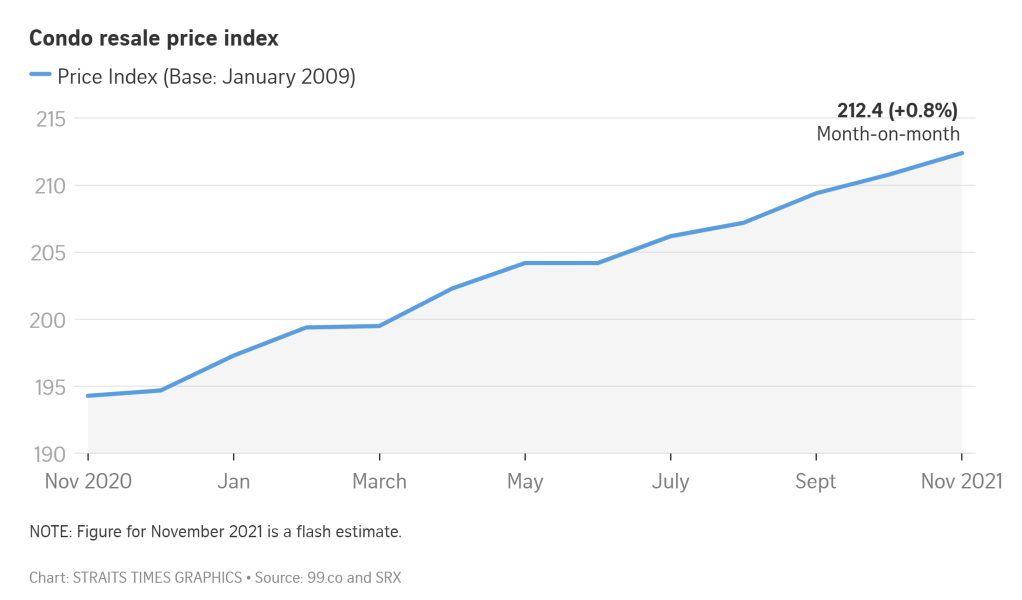 SINGAPORE – Condominium prices in Singapore continued to rise last month, inching up by 0.8 per cent to mark the 16th consecutive month of price rises, according to flash figures by 99.co and SRX Property released on Tuesday (Dec 14).